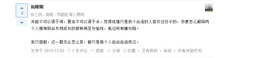 婚姻是一种修行。天地万物任何一种存在都其存在的理由。修行之路,就是领悟无形无形存在的背后是什么。于是理解你所不能理解的事物就非常重要了。女人是最难理解的一种动物,甚至连她们也无法理解自己。在婚姻中,你必须和一种你所不能理解的人创造共同的生活,你必须学会以她的角度看待各种事物,你必须理解另外一种和你截然不同但又同样有效的观念,这必然会提升你的功力。对她来说也是如此。男女是阴阳的最好表征,能调和男女关系,就近乎调和阴阳,近于道。这种方式对双方的要求都很高,万中无一。